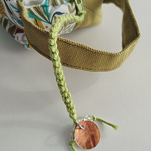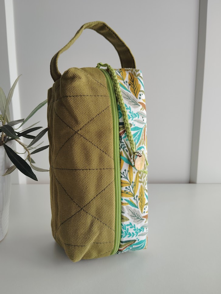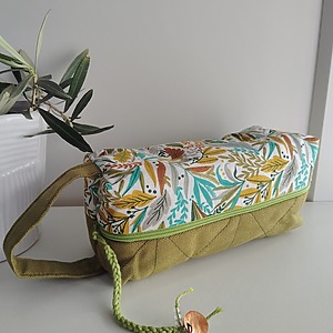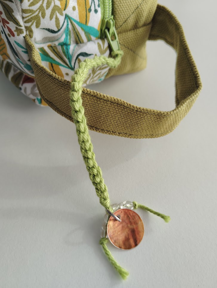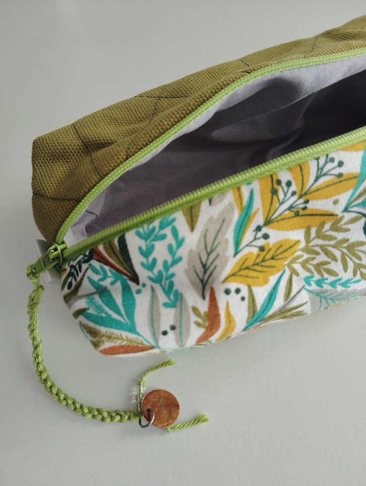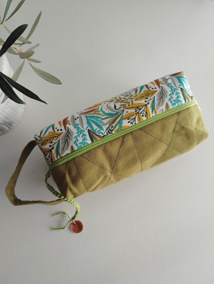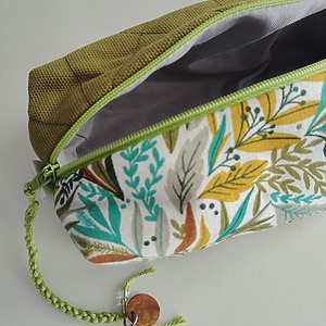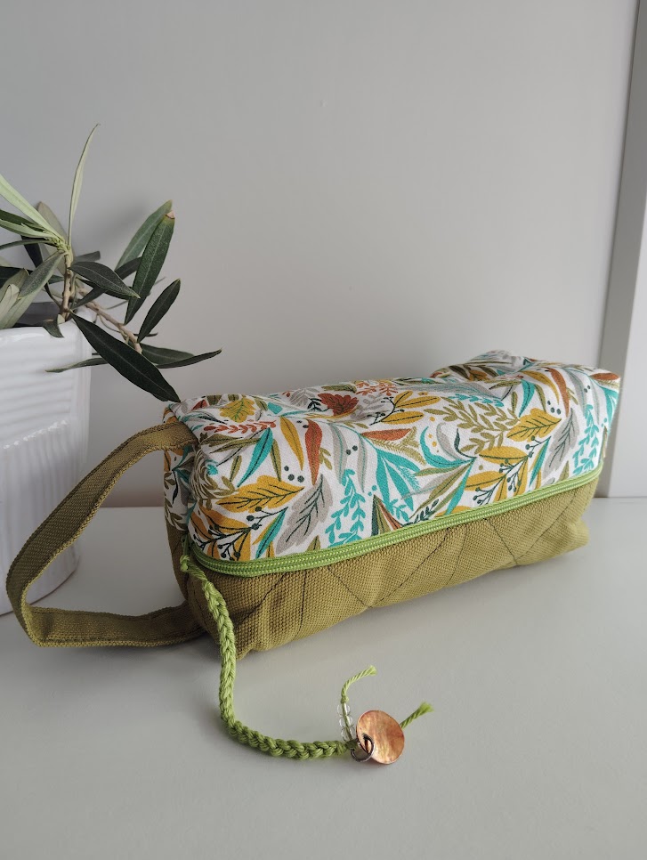 Cette trousse est confectionné entièrement dans mon atelier. Je porte une attention particulière aux associations de matières, couleurs et imprimés ainsi qu’au détails des accessoires. Ici la tirette de la fermeture éclair est fabriqué au crochet par mes soin avec des perles translucide et un petit pendentif en nacre. Le tout molletonné et doublé pour bien protège vos objets.