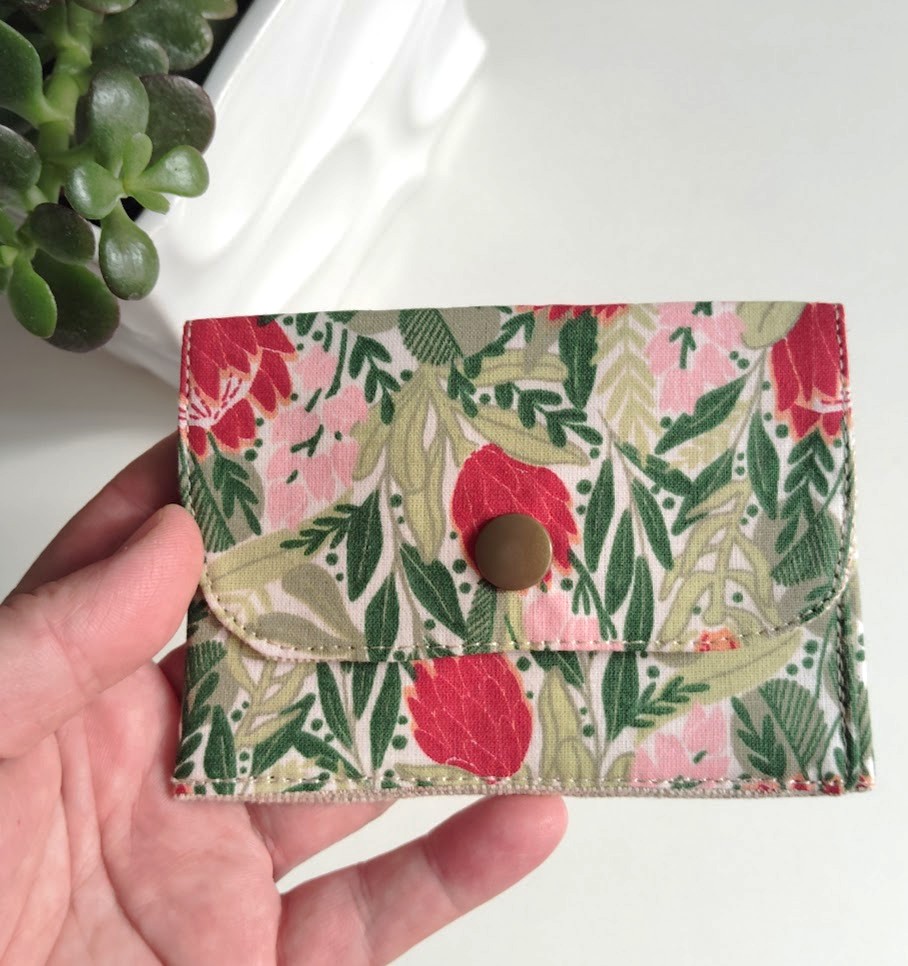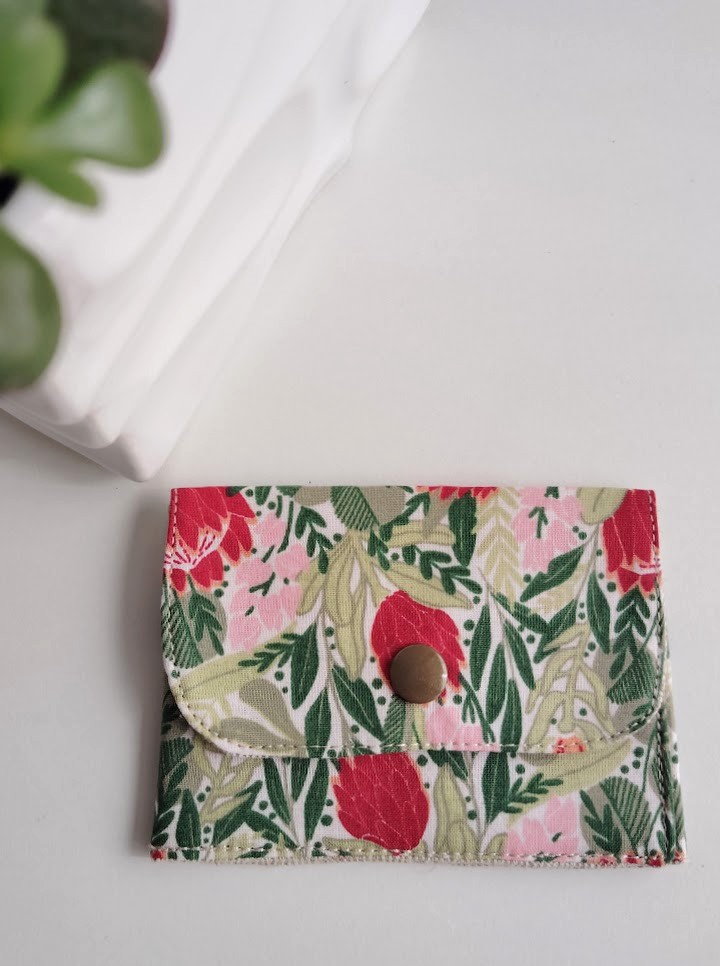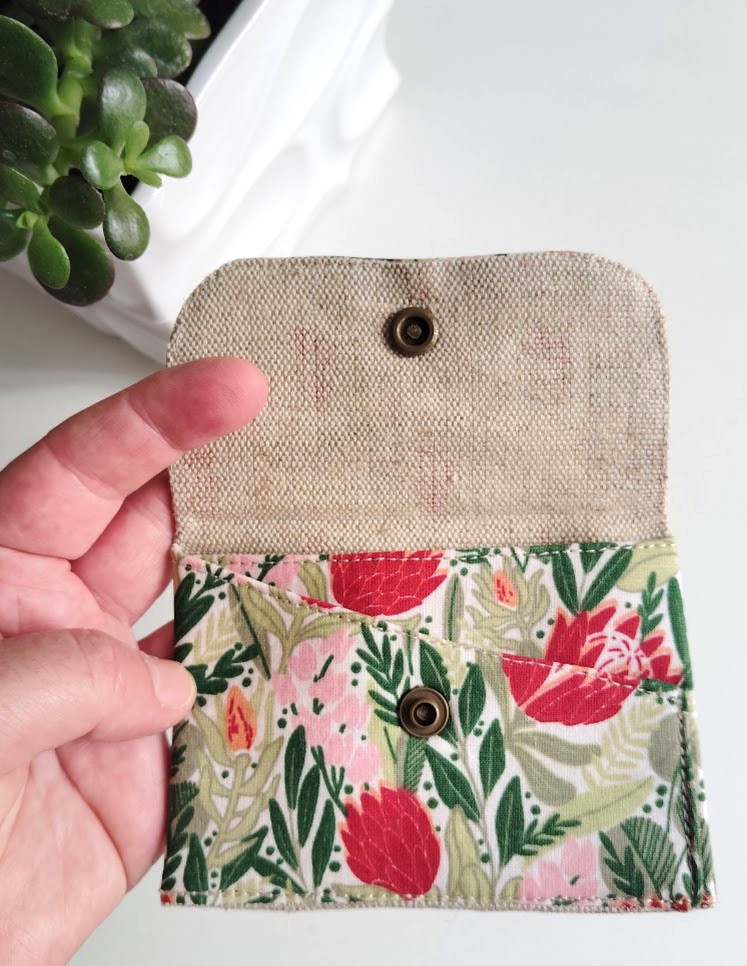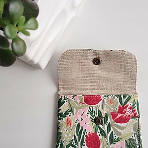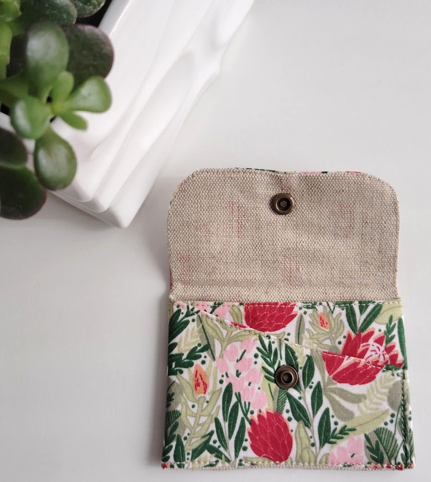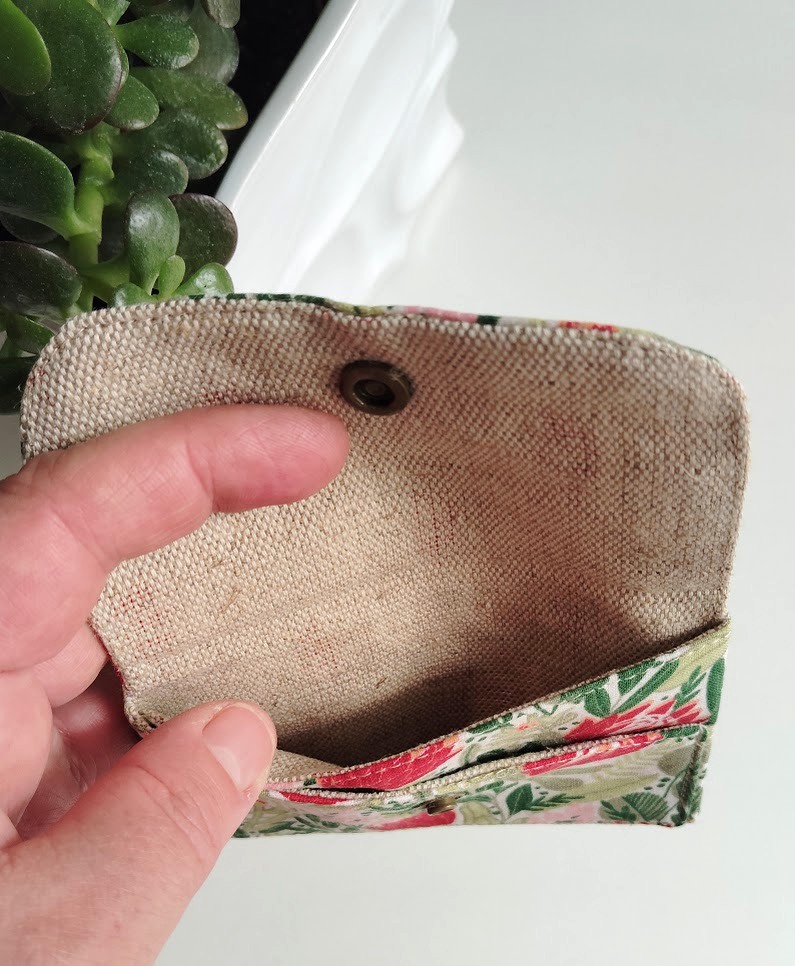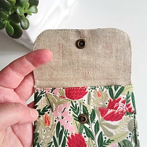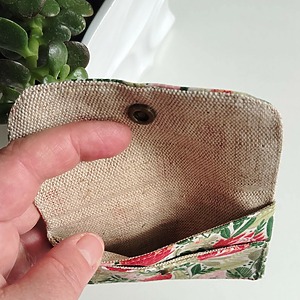 Avec ses deux compartiments il y a assez de place pour y ranger également un billet d’argent. Confectionné dans du tissus imprimé renforcer avec du thermocollant et doublé avec un tissus lin de récupération couleur naturelle. Boutons pression pour fermeture facile et rapide.