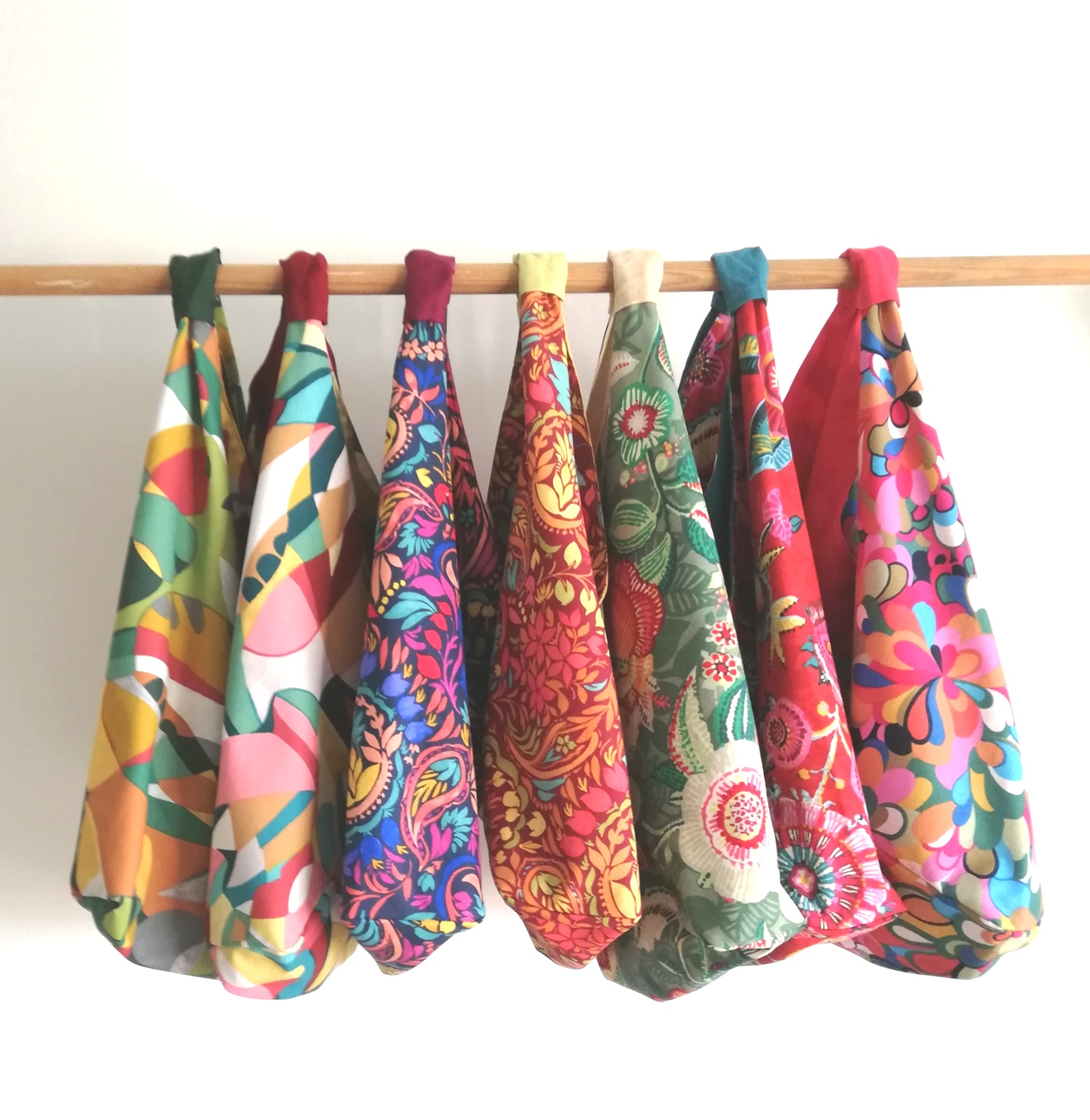 Le sac origami, inspiré de l’art japonais du même nom me permet de travailler des tissus imprimé à grands motifs coloré. Il est fait pour celles qui aiment les grands sacs pour ranger plein d’affaire dedans. Pour les voyageuse, il peut se plier et se glisser facilement dans une valise.