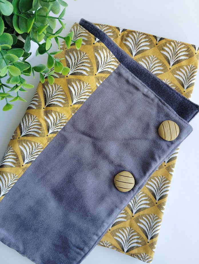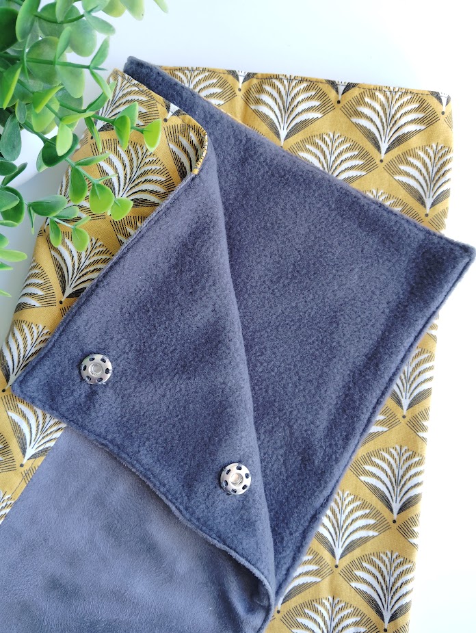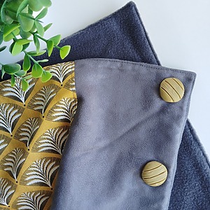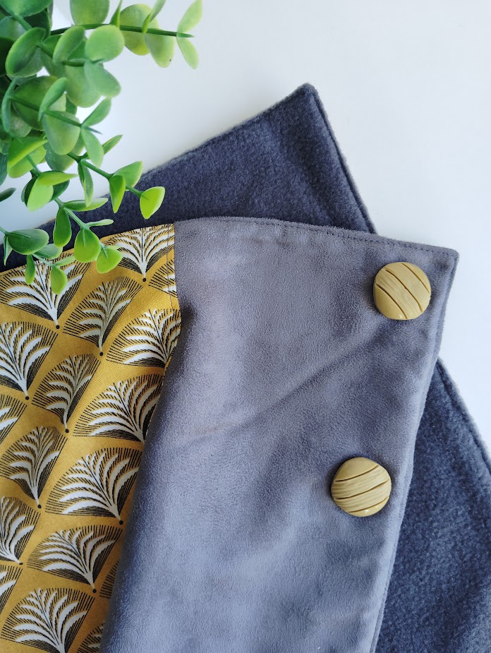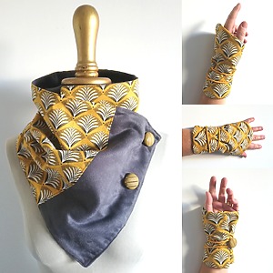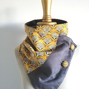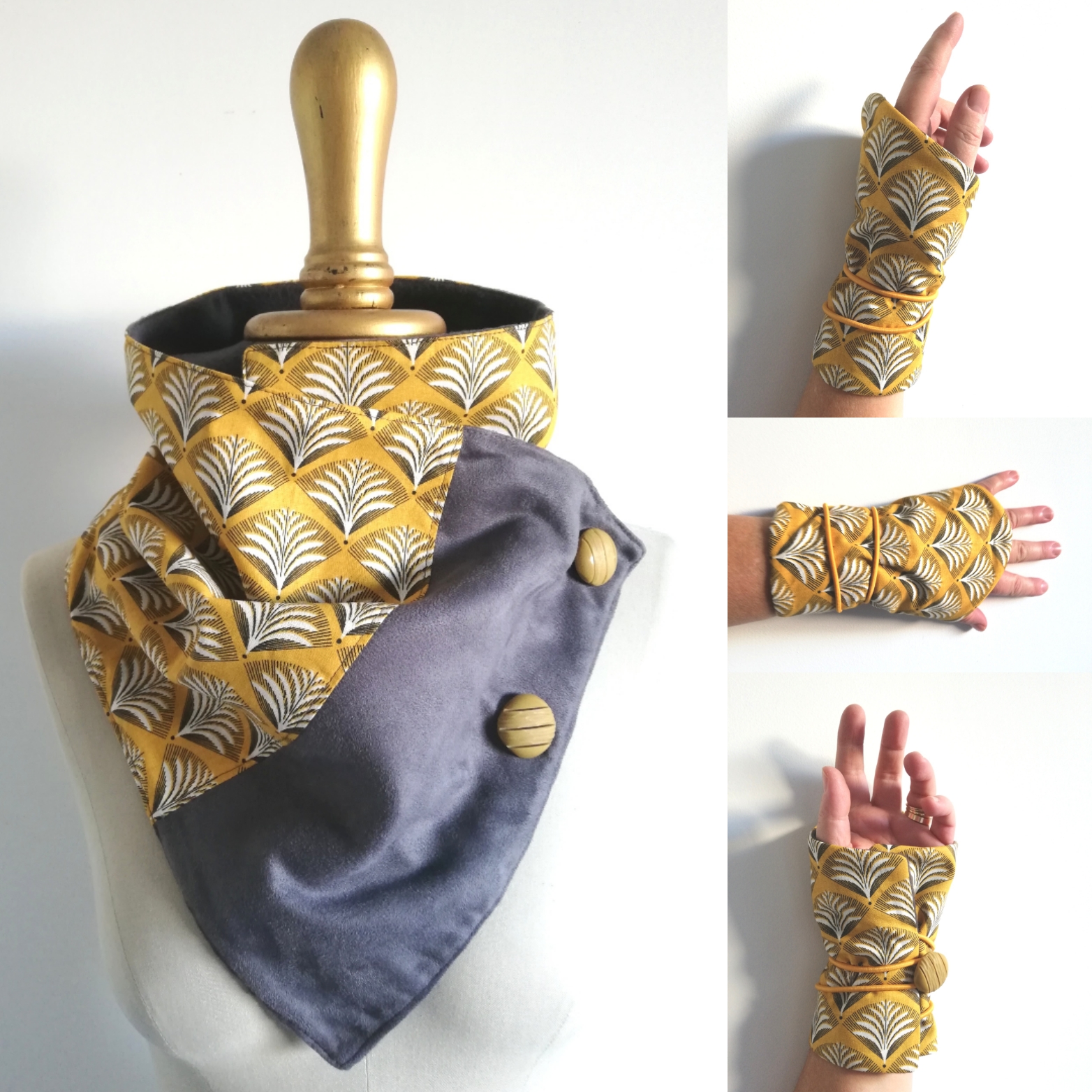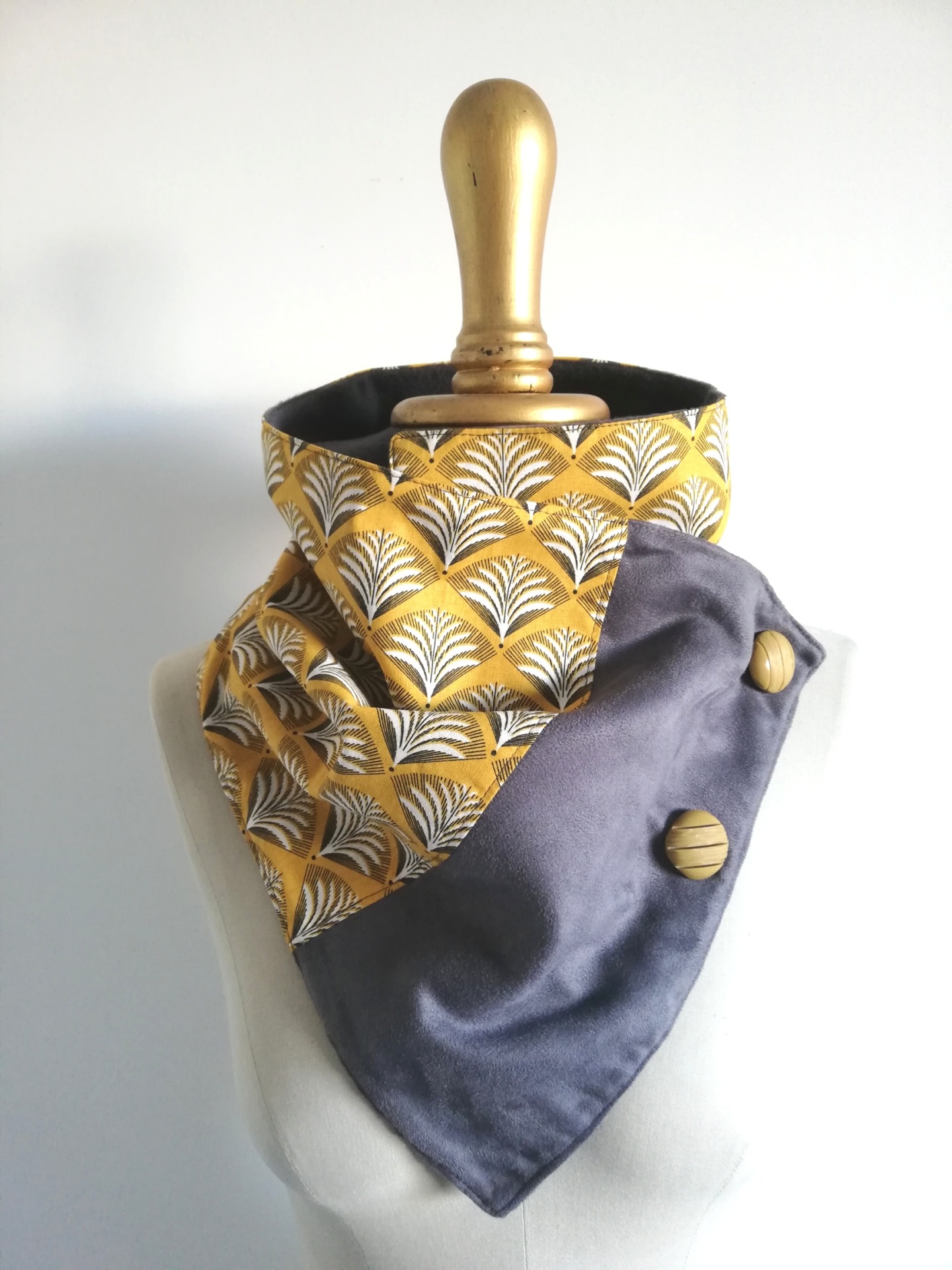 Ce tour de cou permet de mettre en valeur vos pulls, vestes ou manteaux avec élégance. Le tissu en coton imprimé est rehaussé par un tissu suédine et des boutons vintage assortis. Doublé de polaire le tour de cou vous procure confort et chaleur. Il s’enroule autour du cou et est maintenu par deux boutons pressions cousu main. Pour un look encore plus aboutis je vous propose les mitaines assorties 😉